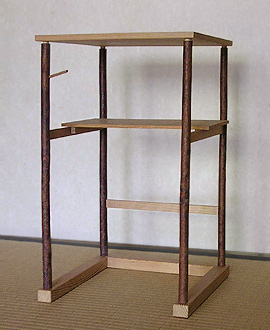 A type of pitcher shelf *mizusashidana 水指棚. A version of the kan'undana 寒雲棚 favored by tea master Gengensai 玄々斎, it was reduced in size by tea master Ennōsai 円能斎. This type of shelf is constructed in the wabi わび style. It has four posts made of red pine with the bark left on, and two shelves made of red cedar, with the grain showing kiji 木地.