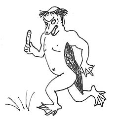Lit. river child. A supernatural water-sprite believed to inhabit Japan's lakes and rivers. The name kappa varies from region to region, including kawatarō 河太郎, kawako 河伯, and kawaranbe 河ランベ. The appearance of a kappa also varies, but kappa are generally thought to be about the size of a young boy, and covered with green scales. They also have a snout, bobbed hair, and a saucer-like depression on the top of the head that holds water. When this water supply diminishes, the kappa's special powers diminish. Kappa swim well thanks to webbed feet and hands, but can also walk on land. Kappa also can rotate their arm and leg joints fully. Some kappa resemble otters, turtles with beaks, or have wings. Kappa are said to be fond of cucumbers and of sumō 相撲 wrestling. In some regions kappa are thought to be helpful, but generally their reputation is far more malicious. In particular, kappa delight in abducting humans and horses. Kappa are noted for their aversion to metal objects. Illustrations of kappa frequently are included in Edo period anthologies of supernatural tales. Kappa are often depicted in comical paintings *giga 戯画 in paintings accompanying verse (see *haiga 俳画) and occasionally appear in *ukiyo-e 浮世絵.