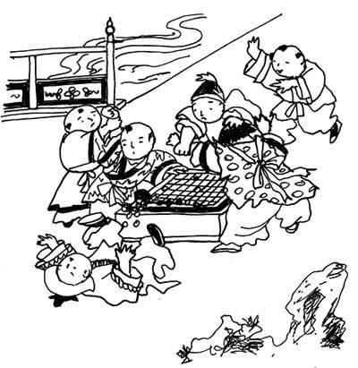 Ch: tangzi you. A painting subject of Chinese children at play. The theme has two types: in the first children play with the pot-bellied eccentric Budai (Jp: *Hotei 布袋); in the second they frolic in a court garden. The children typically play games such as hide-and-seek or tag, but sometimes are depicted in adult activities such as the four accomplishments *kinkishoga 琴棋書画. In China, the subject was a favorite of Song Academy painters. In Japan, the theme often was rendered by Kano school *Kano-ha 狩野派 artists. Later, it was parodied by *ukiyo-e 浮世絵 artists, notably Suzuki Harunobu 鈴木春信 (1725-70) and Torii Kiyonaga 鳥居清長 (1752-1815).The subject is also used for ceramic and lacquer designs.