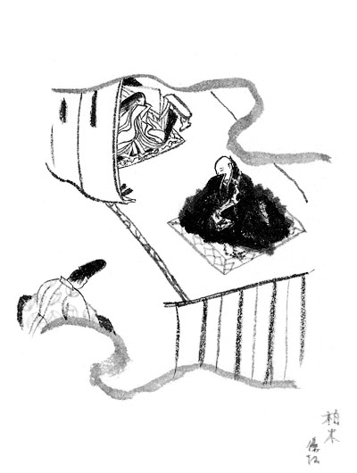 A pictorial subject taken from "The Oak Tree" Kashiwagi, a type of oak, Quercus deutata, Chapter 36 of Genji monogatari 源氏物語 (The Tale of Genji). Suffering remorse over his affair with Genji's wife, the Third Princess Onna San no Miya 女三宮, Kashiwagi, son of Tō no Chūjō 頭中将 (see *Wakana 若菜), declines into terminal illness. The princess gives birth to Kashiwagi's son Kaoru 薫 and eventually becomes a nun. Kashiwagi dies after telling some of the truth to his friend and Genji's son *Yūgiri 夕霧. Kashiwagi asks Yūgiri to look after his official wife Princess Ochiba, Ochiba no Miya 落葉宮 (also known as the Second Princess). Scenes frequently chosen for illustration include: (1) Kashiwagi, in a white robe on his sick bed, reading a brief letter from the Third Princess. In a different room, his father and an ascetic confer about his condition; (2) the retired Emperor Suzaku 朱雀, now a monk, visits his distraught daughter, the Third Princess, after she has given birth to Kashiwagi's son, thought by the world to be Genji's. The princess pleads to be allowed to become a nun; (3) Genji (for the world to see) holding his "son" Kaoru in his arms; (4) Yūgiri visiting Kashiwagi's mother and official widow, Princess Ochiba, at her Ichijō 一条 mansion, while the cherry trees are in bloom. Scenes (1)(2) and (3) from this chapter survive in the earliest illustrated version, the 12th-century masterpiece, preserved in the Tokugawa 徳川 Art Museum.