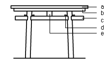 A shinmei type of shrine gate *shinmeitorii 神明鳥居. The two gate posts have an inward incline *uchikorobi 内転 and a very slight taper at the top. The tie beam *nuki 貫 penetrates the posts and extends well beyond them. Wedges *kusabi 楔, driven into the inner and outer faces of the pillars on the upper side of the tie beam strengthen and secure the connections with the posts. Two straight lintels, one on top of the other, crown the pillars: the longer top lintel is called *kasagi 笠木; the shorter secondary one beneath is called *shimaki 島木. The ends of the lintels and the tie beam are cut straight. The tie beam, secondary lintel and top lintel decrease in height respectively. A strut, gakuzuka 額束, is placed between the tie beam and secondary lintel. Example: Kasuga Taisha 春日大社, Honsha 本社 Ichi no Torii 一の鳥居, in Nara.