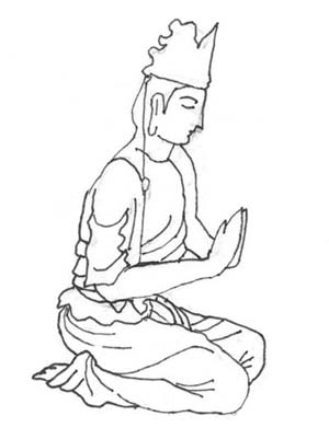 A kneeling position for a Buddhist image. Bodhisattva figures *Kannon 観音 and *Seishi 勢至 often sit this way when they attend *Amida 阿弥陀 in raigō imagery (see *raigō-zu 来迎図). The bodhisattvas in Amida sanzonzō 阿弥陀三尊像 (1148) from Sanzen'in 三千院, Kyoto, are excellent examples. This position is more commonly known as seiza 正座 and is the formal way to sit in Japan.
