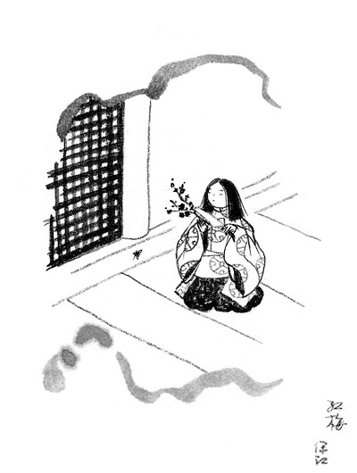 A pictorial subject taken from "The Rose Plum" Kōbai (red plum blossoms), Chapter 43 of Genji monogatari 源氏物語 (The Tale of Genji). Kōbai is a younger brother of the late *Kashiwagi 柏木 and the husband of *Makibashira 真木柱, the widow of Prince Hotaru, Hyōbukyō no Miya 兵部卿宮 by whom she had one daughter. "The Rose Plum" chapter centers around Prince Niou's (see *Niou no Miya 匂宮) interest in this princess. The most frequently depicted scene shows Kōbai's young son at the royal palace, waiting with a branch of red plum blossoms and a letter from his father to present to Niou.