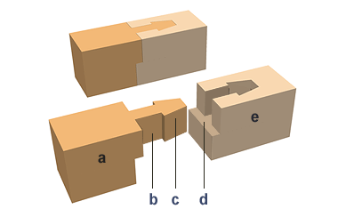 Also shikimen kamatsugi 敷面鎌継. A half-lap, gooseneck tenon joint. An end joint which combines two joints: a half-lap *koshikaketsugi 腰掛継 and a gooseneck tenon joint *kamatsugi 鎌継. The gooseneck mortise and the bench, or seat, of the lap joint are cut so that the mortise occupies about half the thickness of the timber. The bench made from the remaining half extends like a step beyond the mortise. The second timber contains the gooseneck tenon; the undercut overlaps the bench when the tenon is dropped into place in the corresponding mortise. If a half-blind mortise, mechigaihozoana 目違ほぞ穴, is cut vertically into the center of the bench and a matching tenon is made on the undercut part beneath the dovetail, the combination joint is called koshiire mechigaitsuki kamatsugi 腰入目違付鎌継. The half blind tenon prevents damage from twisting forces. Koshikake kamatsugi is based on the same principles as *koshikake aritsugi 腰掛蟻継; only the shape of the tenon and mortise differ. Frequently used to join two hidden purlins (roof joints) *nogeta 野桁, and foundation footings *dodai 土台.