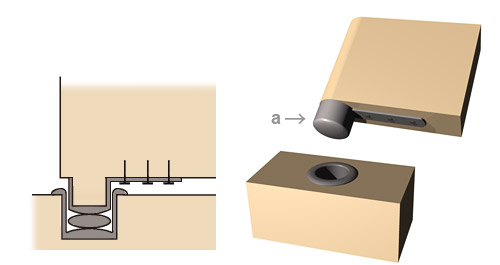 1 A pivot hinge composed of rotund extensions on the top and bottom corners of a door leaf on the side adjacent to the pillar or wall to which the door will be attached. The cavities tomara 戸牡 that receive the hinges are bored out of the lintel *magusa まぐさ and the door sill *shikii 敷居 or *dodai 土台. In general, this type of hinged door is called kururudo 枢戸.