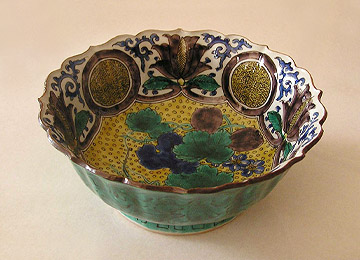 Kutani ware. The term was used from around 1803, but only the original, ko-kutani 古九谷 (old Kutani) was actually made at the Kutani kiln in Kutani 九谷, Ishikawa Prefecture. The ware is famous for its distinctive five-color palette of red, green, yellow, purple, and Prussian blue rendered in bold designs of overglaze enamels. The motifs are first outlined with cobalt blue, manganese black, and iron red and then enamels are applied over them. After firing, the glass-like transparency of the colors allow the underdrawing to become part of the design. In the mid-17th century, Maeda Toshiharu 前田利治 (1618-60), head of the Daishōji 大聖寺 clan, found kaolinic clay for making porcelain in his domain in Kutani. Maeda's retainers Gotō Saijirō 後藤才治郎 and Tamura Gonzaemon 田村権左衛門 (act. about 1655-1703) set up kilns in the villages of Kutani and Suisaka 吸坂 to make tea-ceremony utensils. Gotō's son Tadakiyo 忠清 was sent to Arita 有田 in Kyūshū 九州 to learn porcelain-making techniques. He returned with an exiled potter from Ming China and together they produced what is now termed ko-kutani. Around 1694 the Kutani kilns fell into disuse until 1804 when Aoki Mokubē 青木木米 (1767-1833) came to Kutani and fired a kiln in Kasugayama 春日山. His work inspired the construction of kilns in surrounding areas and re-established Kutani ware, the so-called saikō kutani 再興九谷 (revised Kutani). Kutani ware was exported in great numbers to Europe beginning at the end of the 19th century.
