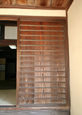 A wooden sliding door constructed of a single wooden panel *wata-ita 綿板 and set into a timber frame *kamachi 框. It is characterized by the addition of thin parallel crosspieces *mairako 舞良子 set horizontally on both sides of the panel. The space between the crosspiece strips is usually about 2.4 cm, equal to the width of the strips. This pattern is called komagaeshi 小間返 (see mairako). More rarely the strips are set vertically. Some mairado have crosspieces on one side only and sliding doors *fusuma 襖, installed behind them. This type began to appear around the late 18th century. The mairado panel is also called hame 羽目 and the crosspieces are called maira bame 舞良羽目.