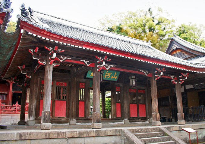 A unique gate at Sōfukuji 崇福寺 (rebuilt in 1827) in Nagasaki prefecture. The size is unusual for an eight-legged gate *hakkyakumon 八脚門, in that it is three-bays wide and has an entrance in each bay. The temple is of the Ōbaku 黄檗 sect. Its architectural elements have strong Chinese influence characteristic of Ōbaku sect temples. The roof is open from the axis of the central pillars to the front of the gate. The rafters *taruki 垂木 are curved but are rectangular in section. Behind it is a three-ridged structure *mitsumune 三棟. Rafters are rectangular in section. The roof is a hip-and-gable type *irimoya yane 入母屋屋根, and is covered with pantile *sangawarabuki 桟瓦葺.