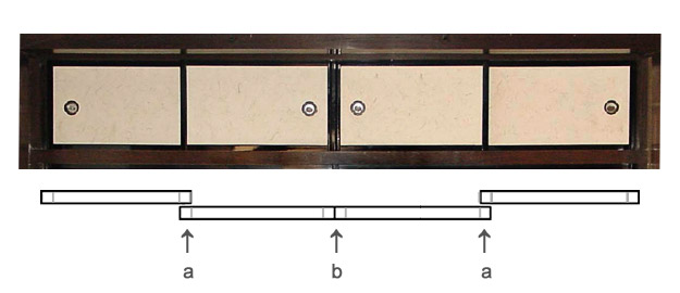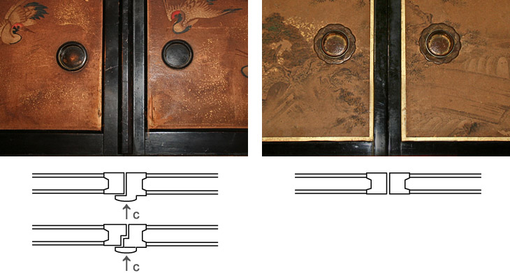 The meeting of two structural elements that butt together. Examples include sliding doors *fusuma 襖 or *shōji 障子, that close on the same track. The frame parts which meet are called meshiawasebuchi 召合縁. One of the butting frames may have a small convex part or astragal called jōgibuchi 定規縁 which covers the very slight gap where the two parts meet. This prevents drafts. If the meeting edges are made with a tongue and groove or with a lap joint *aigaki 相欠, they are called meshiawasegamachi 召合框 or deaigamachi 出合框.