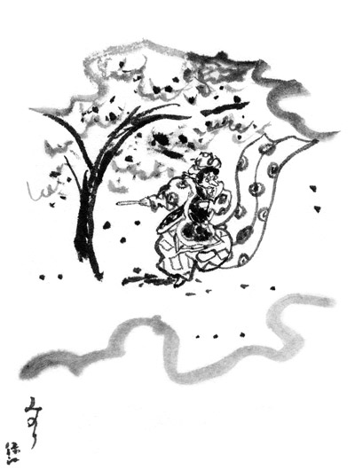 A pictorial subject based on "Minori" ("The Rites" or "The Venerable Law"), Chapter 40 of Genji monogatari 源氏物語 (The Tale of Genji). This chapter revolves around the failing health and demise of Lady Murasaki, Murasaki no Ue 紫の上, Genji's principal wife. One scene often chosen for illustration shows a ceremony of sutra dedication, in which Murasaki, the *Akashi 明石 Lady, the Lady of the Orange Blossoms *Hanachirusato 花散里, and Prince Niō *Niō no miya 匂宮 watch a masked *bugaku 舞楽 performance of *Ryōō 陵王 under the blossoming cherry trees. Another scene depicts the final exchange of poems about the transient dew on the autumn bush clover hagi 萩 between Genji, the dying Murasaki, and her adopted daughter Empress Akashi, Akashi no Chūgū 明石中宮. The latter scene is included in a section of the earliest extant illustrated version of The Tale of Genji (12th century) preserved in the Gotō 五島 Museum, Tokyo.