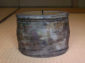 Also mizutsubo 水壷. Lit. "a water jar." A container of fresh water used either to fill the tea bowl *chawan 茶碗, or the kettle *chanoyugama 茶湯釜, in the tea ceremony. When a large portable shelf *daisu 台子, or single portable shelf *tanamono 棚物, is used, the mizusashi is placed there. When the tea ceremony begins with the carrying in of a utensil, the water jar is the first to be brought in. However, because it is relatively large, it is more often put in place beforehand on either the host's mat *temaedatami 点前畳, the daisu or on the long board *naga-ita 長板. In this case, all other preparations are completed before the guests enter. Upon entering the guests admire the alcove *tokonoma 床の間, followed in sequence by the kettle and brazier, the water jar and other utensils before sitting down. Most of the water jars are ceramic but some are lacquer, others are made by bending wood into a circle with bottom attached *magemono 曲物, and still others are made of bamboo. Most have matching covers, tomobuta 共蓋, and are made of the same ceramic or lacquered wood as the body of the kettle; *setoyaki 瀬戸焼, *shigarakiyaki 信楽焼, *bizenyaki 備前焼, *satsumayaki 薩摩焼, Ninsei 仁清, and Kenzan 乾山 wares are among the most esteemed.