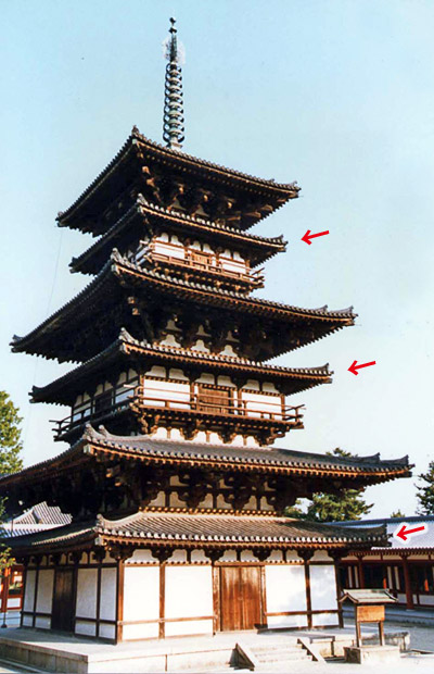 Also written 裳層. Also pronounced shōkai. A pent roof enclosure usually one bay deep. Its structure may extend from the aisles *hisashi 廂, on one to four sides. Mokoshi may also surround the core *moya 母屋, of a building directly. If that is the case the hisashi are omitted. The difference between hisashi and mokoshi is that the tie beams *nuki 貫, of the mokoshi are directly inserted into the shafts of the pillars. It looks like a two-storied building from outside, although this is not, in fact, the case. Its roof and enclosure are like a skirting. Mokoshi were widely used in *zenshūyō 禅宗様 architecture introduced to Japan in the late 12th century. The Dōshunji Kannondō 洞春寺観音堂 (1430) in Yamaguchi Prefecture is a good example. Yakushiji Tōtō 薬師寺東塔 (early 8th century) in Nara, appears to be six stories but that is because a mokoshi was placed between each story. During the 16th-19th century, pent roof construction was called *yuta-zukuri 雪打造.