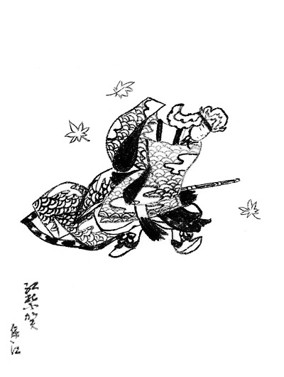 Lit. "celebration of autumn leaves." A pictorial subject based on Chapter 7 of Genji monogatari 源氏物語 (The Tale of Genji) entitled "Momiji no ga," translated as "An Autumn Excursion." In this chapter, Fujitsubo 藤壷 (see *Kiritsubo 桐壷) becomes pregnant as a result of her affair with Genji 源氏, and the prince born to her bears an unmistakable resemblance to Genji, rather than to the Emperor Kiritsubo. The most frequently illustrated scene is the rehearsal in the imperial garden of a performance to be given during the royal excursion, where Genji and his friend Tō no Chūjō 頭中将 dance Waves of the Blue Ocean, Seigaiha 青海波. Another scene illustrated from this chapter shows a young Murasaki (see *Wakamurasaki 若紫) playing with dolls and small dollhouses while her nurse tells her to be more wifely.
