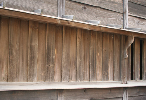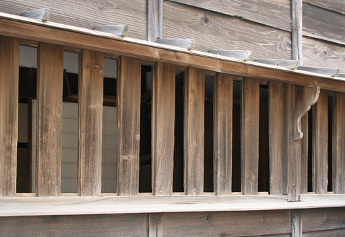 Abbreviated term for musō renjimado 無双連子窓, also further shortened to musō 無双. A window made of narrow boards or slats, wider than ordinary muntins, taterenji 竪連子, set vertically in a line with approximately the same size spaces between them. These slats are fixed. On an inside track, boards of the same size are placed in a sliding frame so that the open spaces between the immovable slats can be partially or completely closed. Musōmado regulate ventilation, especially when used on the top or bottom of rain shutters *amado 雨戸. They are also used in the transoms *ranma 欄間, of kitchens and in the kitchenette *mizuya 水屋, in a tea ceremony room *chashitsu 茶室. The width and height vary according to need and location.
