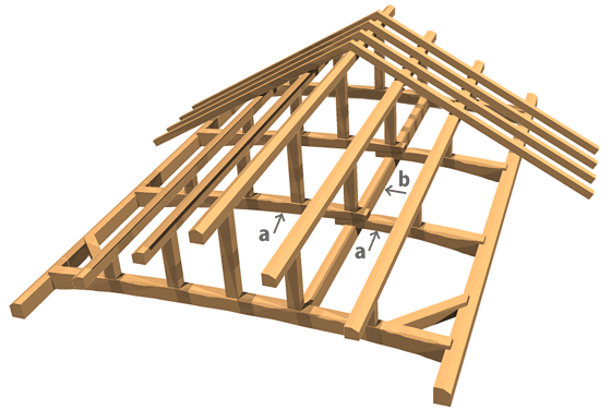 A transverse beam *hari 梁 made in two sections and coupled by a stub-tenon-scarf joint, koya daimochitsugi 小屋台持継, and secured by pins *daboso 太ぼぞ and bolts. The nagekakebari is strengthened by a shortened purlin called*shikibari 敷梁 which runs parallel to the ridge and is supported by large pillars. This type of beam is usually found in a building with a wide transverse measure.