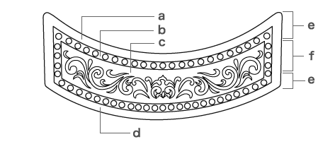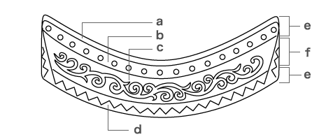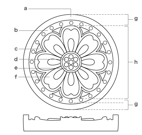 a) *shūen 周縁 b) shumontai 珠文帯 c) kanben 間弁 d *renji 連子