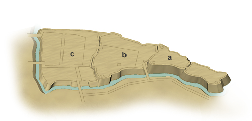 Castle plan; general term for the layout of a castle and its component structures. Lit. "stretched rope," the term is said to derive from the fact that originally a rope was stretched between stakes, positioned at intervals, to determine the placement of the castle compound and components. Before the 17th century, precise drawings were not made; a general plan of a castle and its surroundings were made directly, according to the lay of the land. Fundamental to the plan is the placement of the enclosures *kuruwa 郭, moats *hori 堀, earth and stone ramparts *doi 土居 and sekirui 石塁, entrances *koguchi 虎口 and roads. Castles are classified into single-compound and multi-compound structures. Multiple-compound castles were constructed in a number of different layouts, including concentric circles, concentric squares, plans with compounds aligned along an axis or those with whirlpool layouts or star-shaped plans. They are called *teikakushiki 梯郭式, renketsushiki 連結式, goryōkakushiki 五稜郭式. Plans are also conceived in terms of the basic function of the castles: some are primarily defensive, whilst others are offensive installations. Early modern Japanese military scholars, using the principles of Chinese yin and yang thought, termed defensive castle plans in-no-nawa 陰の縄, and offensive castles plans yō-no-nawa. 陽の縄. Similar terminology was applied to component castle structures.