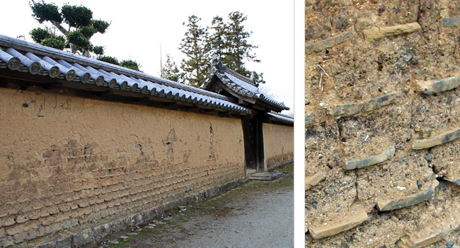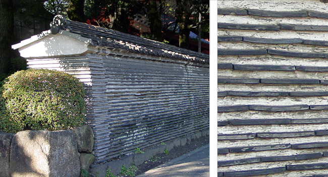 A mud fence (a type of earthen wall *dobei 土塀) constructed with alternating layers of rectangular tiles and clay. It is used as exterior wall, sotobei 外塀, to enclose the gardens *roji 露地 of a tea house *chashitsu 茶室. It was also used to surround aristocratic dwellings and temples in the Edo period.