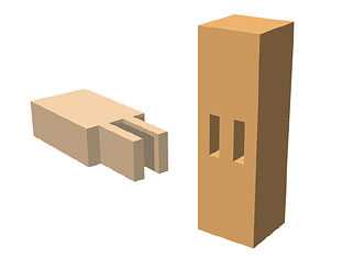 Double tenons. Double tenons take many forms including individual, rectangular tenons of the same size placed side by side and carved from the end of a single timber beam, or U-shape tenons cut from the end of a beam. Quadruple tenons cut from the same beam end are called *yonmaihozo 四枚ほぞ. Finger tenons or channel tenons, collectively called *wanagihozo 輪薙ほぞ are used only on king posts *shinzuka 真束 that support the ridge *munagi 棟木 of a building. All these tenons are used for right angle joints.