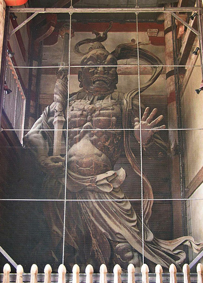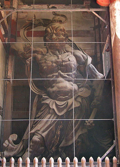 Also written 二王. Also called *niten 二天 and Niōson 仁王尊. Lit. "two kings" or "benevolent kings." A pair of temple guardians who stand on either side of a temple gate. Their fierce faces with glaring eyes, powerfully muscular bodies, and threatening poses bearing weapons, serve to ward off evil spirits. Typically the Niō are represented as nude from the waist up, although very early images wear chest armor. Generally one opens his mouth, in the *agyō 阿形 position (the shape of mouth saying "a" あ ) and holds a thunderbolt (Sk: vajra, Jp: *kongōsho 金剛杵), while the other closes his mouth, in the ungyō 吽形 position (the shape of mouth saying "un" うん) and holds a large sword. They are sometimes called *Kongō rikishi 金剛力士 and Misshaku rikishi 密迹力士, respectively, indicating two different aspects of one deity named Misshaku kongō 密迹金剛. However, there are various opinions as to the identities of the Niō, and none seems to clearly prevail. Iconographically, Niō are associated with *Shukongōshin 執金剛神. Chinese examples include large rock-cut sculptures at Longmen (Jp: Ryūmon 竜門) and Yungang (Jp: Unkō 雲岡). The earliest Japanese examples are the dry-lacquer *kanshitsu 乾漆 sculptures wearing armor and placed on the Buddhist altar, Shumidan 須弥壇 at Tōdaiji *Hokkedō 東大寺法華堂 (popularly called the Sangatsudō 三月堂, also known as Kongō rikishi; 8th century), and the nude example at Hōryūji 法隆寺 *Chūmon 法隆寺中門 (711). The best known Niō are the huge images at Tōdaiji *Nandaimon 南大門 (1207) by Unkei 運慶 (?-1223) and Kaikei 快慶 (late 12th-early 13th century).