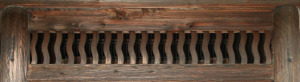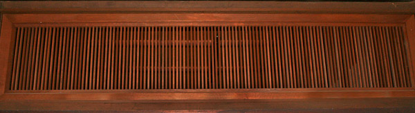 There are many kinds of decoration used in the transoms. The most common is plain latticework kōshi ranma 格子欄間, like that used on the inside of the doors at Byōdōin *Hōōdō 平等院鳳凰堂 (1053) in Kyoto. Another common type of lattice is laid diagonally forming a lozenge pattern hishigōshi ranma 菱格子欄間. There is also the *yumi ranma 弓欄間, which has curvilinear slats set into a transom. The osa ranma 筬欄間 has closely-spaced vertical bars and a small number of horizontals set across them. When the same type of lattice is used for transoms above a veranda, it is called saya ranma 鞘欄間. Transoms called *ita ranma 板欄間 have thin boards with openwork designs cut into them or arranged decoratively with an open area. The bamboo node transom *take-no-fushi ranma 竹の節欄間, has posts that are grooved at the base and neck to resemble bamboo nodes. The intervals between the posts have double wood strips that run diagonally.