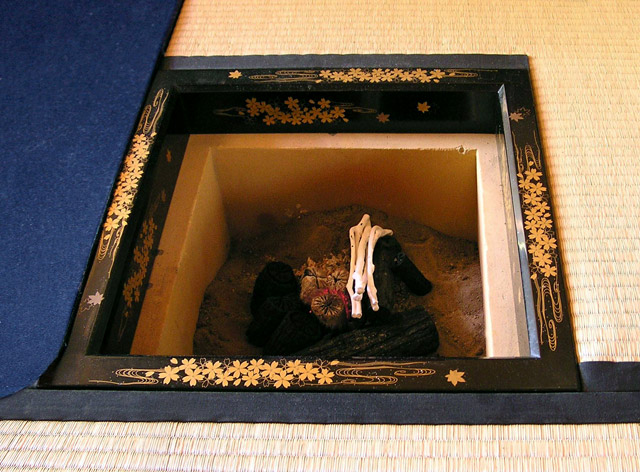 During the season when the portable brazier is used (from April 1 to October), the mat used with the fixed-hearth is changed and the frame is taken off. When the fixed-hearth is set into the middle board *naka-ta 中板, or merely covered with a wooden lid *robuta 炉蓋, the frame is also removed, allowing the cover to be level with the surface of either *tatami or naka-ita.