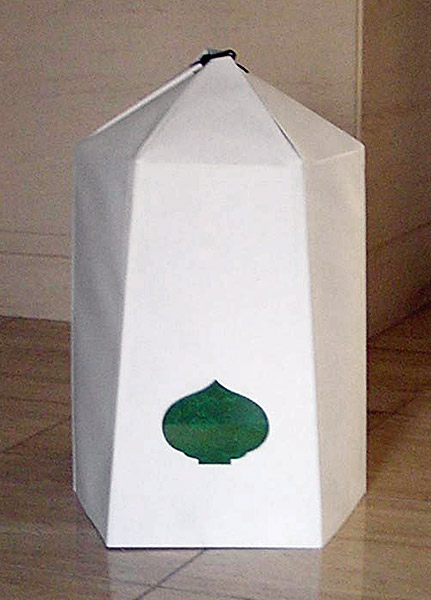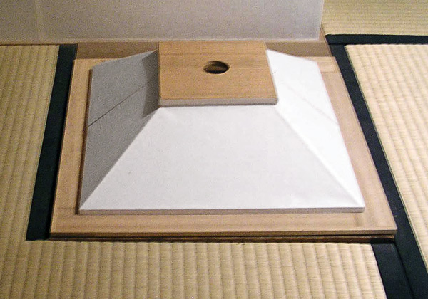 The lid is level with the surface of the matting *tatami 畳. A small round hole 1.5 cm in diameter is cut in the exact center. If the fixed-hearth is located within the middle board *naka-ita 中板, the lid is made of the same kind of wood as the middle board.