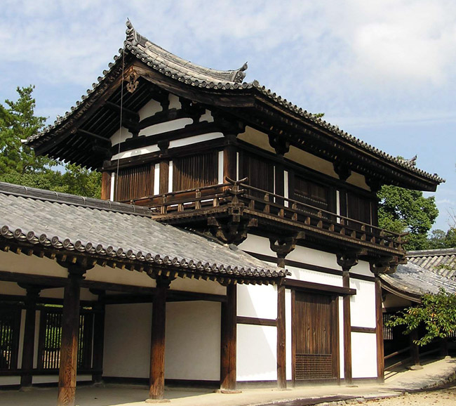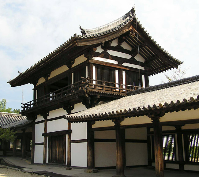 A gate *rōmon 楼門, that appears to have two stories, but in reality is a high gate with a very shallow veranda and balustrade that surrounds the entire building just above the first story. Two examples of building that appear to have stories are the sutra repository *Kyōzō 経蔵 (8th century) and the belfry *Shōrō 鐘楼 (late 10th - early 11th century) at Hōryūji Sai'in 法隆寺西院 in Nara, and the drum tower *Korō 鼓楼 (1240) at Toshōdaiji 唐招堤寺, also in Nara. Such buildings are mainly associated with temples and shrines. According to some scholars, the only true two-storied gate is at Kinpusenji 金峯山寺 (1588) in Nara.