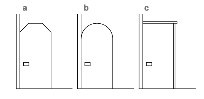 a) *hakamagoshi 袴腰   b) *katōguchi 火灯口  c) *hōdateguchi 方立口