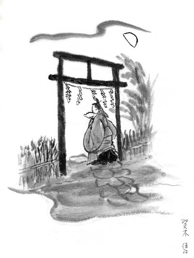 A pictorial subject based on "Sakaki" ("The Sacred Tree"), Chapter 10 of Genji monogatari 源氏物語 (The Tale of Genji). One autumn night Genji, holding a spray of sakaki, enters the rustic temporary shrine precincts of Nonomiya 野宮 to bid farewell to Lady Rokujō, Rokujō no Miyasudokoro 六条御息所 and her daughter who is finishing preparations to become priestess at Ise 伊勢. Genji and his former lover exchange poems. Illustrations of this chapter, such as the hanging scroll by Iwasa Matabei 岩佐又兵衛 (1578-1650; Idemitsu 出光 Museum of Art, Tokyo), typically show a shrine gate *torii 鳥居 of unbarked wood and the thick grasses surrounding Nonomiya. In this chapter, Emperor *Kiritsubo 桐壷 dies and his consort (and Genji's secret lover) Fujitsubo 藤壷 (see *Wakamurasaki 若紫) enters a religious order. During the summer Genji makes a secret visit to Oborozukiyo 朧月夜 (see *Hana-no-en 花の宴) and is discovered by her father, whose report of this provokes the wrath of the emperor's mother, Lady Kokiden, Kokiden no Nyōgo 弘徽殿女御, which eventually results in his exile from the capital.