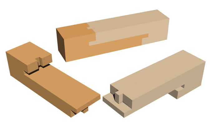 Keywords Architecture Joints A wooden splicing joint used for a beam. The length of the joint is 3x the height of the beam and the tenon *hozo ほぞ is normally half that distance.