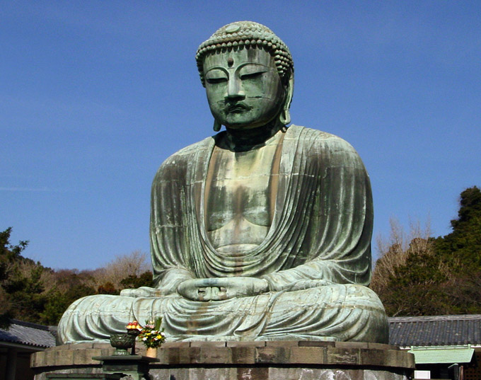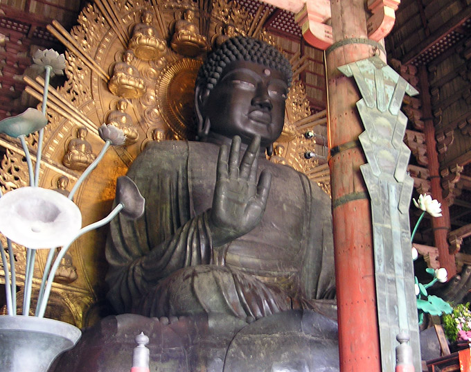 Lit. "three great Buddhas." The three largest images in the history of Buddhist statuary in Japan. Originally the sandaibutsu were said to be the Great Buddha in Tōdaiji 東大寺, Nara; the Buddha in Taiheiji 太平寺, Osaka; and the Buddha in Sekidera 関寺, Shiga Prefecture. In later centuries, after the latter two statues were lost, this designation changed, and the Buddhas of Tōdaiji, Kōtokuin 高徳院 in Kamakura (Kanagawa Prefecture), and the Asuka Buddha in Angoin 安居院 (formerly part of Hōkōji 法興寺) Nara, were referred to as the sandaibutsu. The Great Buddha of Nara Nara Daibutsu 奈良大仏 was consecrated in the year 752. It is a seated bronze figure 14.73 m high representing Vairocana Buddha *Rushanabutsu 盧遮那仏, and although it has been damaged by fire on numerous occasions the original figure is still preserved in Tōdaiji. The Great Buddha of Taiheiji was a standing figure of the *Kannon 観音 18 m high. This figure was said to have inspired the building of the Nara Daibutsu, but it was very seriously damaged in 1086. The seated figure of *Miroku 弥勒 in Sekidera, was destroyed in an earthquake in 976. It was restored by the sculptor Kōshō 康尚, and the new statue in wood and lacquer, completed in 1018, measured 7.5 m in height. This in turn was destroyed in a fire caused by war in the period 1596-1615. The Asuka Daibutsu 飛鳥大仏 is a bronze statue 2.75 m high, thought to represent *Shaka 釈迦. It is the oldest surviving Buddhist statue in Japan today, estimated to have been completed in the year 609. Temple legend says that the sculptor was the famous Kuratsukuri no Tori 鞍作止利. The statue sits on a stone pedestal in the cross-legged posture known as *kekka fuza 結跏趺坐. The Kamakura Daibutsu 鎌倉大仏 is a cast bronze seated figure representing *Amida 阿弥陀. It was made in the mid-Kamakura period; some records suggest that casting may have begun in 1252. The statue is 11.5 m high, and combines stylistic influences from Southern Song China in the face and body with Unkei 運慶 (?-1223) style draperies.