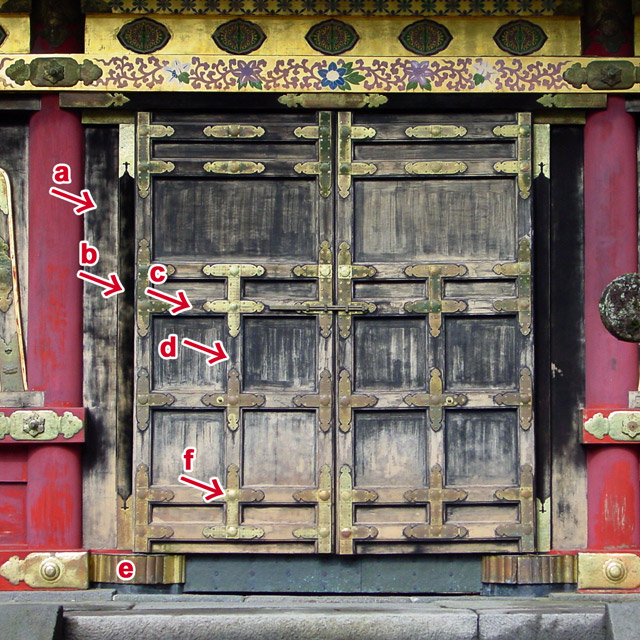 a) wakihame 脇羽目 b) *hōdate 方立 c) *yokozan 横桟