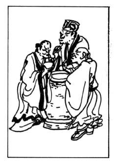 Ch: sansuantu. A painting subject of three san 三, Northern Song Chinese sages tasting wine san 酸, from a vat. According to legend, one day the famous poet Su Dongpo (Jp: *So Tōba 蘇東坡, 1039-1112) and his friend Huang Shangu (Jp: *Kō Sankoku 黄山谷), went to a temple called Jinshansi (Jp: *Kinzanji 金山寺) to look for the monk Foyin (Jp: Futsuin 仏印). Foyin, glad to see his friends, brought out a large jar of peach wine and each man eagerly tasted the brew. Simultaneously all three men raised their eyebrows and puckered their lips in surprise at the bitter taste. The three figures represent China's Three Creeds *Sankyō 三教: Su Dongpo standing for Confucianism, Huang Shangu for Taoism, and Foyin for Buddhism. The incident serves as a parable for the ecumenical doctrine that the Three Creeds are One Sankyō itchi 三教一致 in that the astringent taste of the wine shocks each of the three different men into recognition of the same reality. In some cases the three figures are depicted as the founders of the three religions, Confucius (Jp: *Kōshi 孔子), Laozi (Jp: Rōshi 老子) and Shakyamuni (Jp: *Shaka 釈迦), or alternately, as Tao Yuanming (Jp: *Tō Enmei 陶淵明), Lu Xiujing (Jp: Riku Shusei 陸修静, 406-477) and Huiyuan (Jp: Eon 慧遠, 334-416), the same three men who appear in the Three Laughers at the Tiger Ravine (Jp: *Kokei sanshō 虎渓三笑). As with the related subjects Three Creeds are One and Three Laughers at the Tiger Ravine, the Three Sages Tasting Vinegar was popular with Muromachi and Momoyama period painters. There are well-known examples by Yan Hui (Jp: Gan Ki 顔輝, late 13th to early 14th century), Reisai 霊彩 (act. 1435-1460's) and Kaihō Yūshō 海北友松 (1533-1615, Myōshinji 妙心寺, Kyoto). In *ukiyo-e 浮世絵 versions *mitate-e 見立絵 often show three famous beauties, Ono no Komachi 小野小町 (see *nanakomachi 七小町), Yang Guifei (Jp: *Yōkihi 楊貴妃), and *Sotōrihime 衣通姫, in the role of the "Three Tasters."