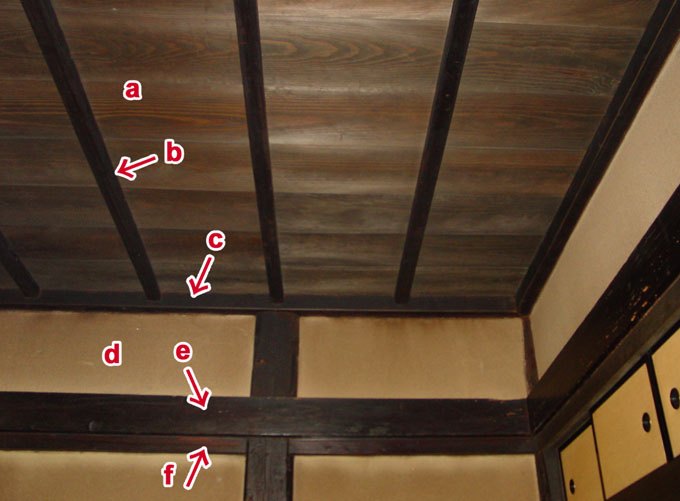 a) tenjō-ita 天井板 b) *saobuchi 竿縁 c) *mawaribuchi 回縁