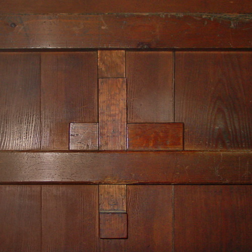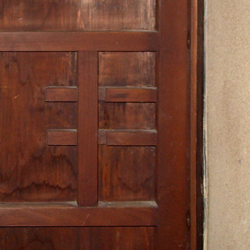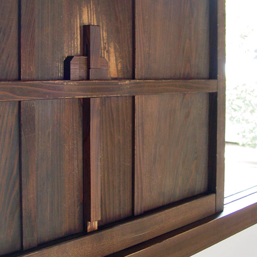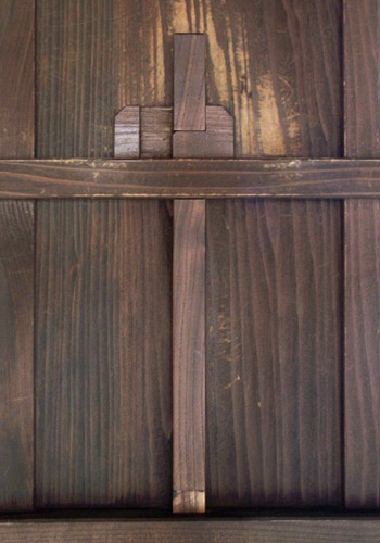 2 Lit. "monkey." A monkey or cat bar or bolt, so named because of its ability to keep a door securely closed. Myth has it that once a monkey grasps an object, it will never release it. Thus, the name for one type of bar or bolt. A long, slender wooden bar attached to the stile *tatezan 竪桟, or rail san 桟, of a door. The most common saru, called yokozaru 横猿, are designed to slip into a catch horizontally. Others, called agezaru 上げ猿, can be moved up and down vertically from the top rail and inserted into a groove made on the head jamb *kamoi 鴨居 of sliding doors or rain shutters *amado 雨戸. Sagezaru 下げ猿 or otoshizaru 落し猿 are attached to a bottom rail and are pushed down into a groove on the threshold. The crosspiece provided to secure the bar is called yosezaru 寄猿. When the doors *shōji 障子, are flush, the bolt is called horikomizaru 彫込猿 or flush bolt. See *sarudo 猿戸.