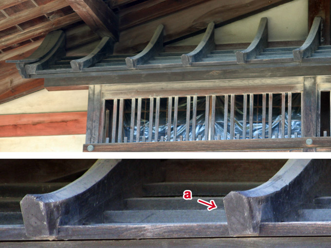 Lit. "monkey head pent roof." A pent roof *hisashi 廂, with pentagonal members added for support above the board roofing. When the roof curves close to the eaves, the pentagonal members, peaked on top, are placed to follow the curve.