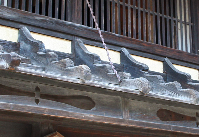 Lit. "monkey headpost." A general term for timber members of pentagonal cross-section, created by chamfering away the upper corners of a rectangle to create a triangular or pointed top which can shed water easily. It is used where long timber members may be exposed to the elements, for instance the rails of balustrades rankan 欄干, and in gates. The pointed side usually faces the elements. Much used, too, for the ridge pieces *munagi 棟木, and transverse bracing members of a type of used for roofed fences yanetsuki itabei 屋根付板塀, small roofs *koyane 小屋根, or sunshade pent roofs hiyokebisashi 日除け廂. The board roofs are made of from two, three or four overlapping strips of boarding, and the sarugashira, which are planted on top to hold the boarding in place, accordingly, have a stepped profile. When used for a roof with a varying pitch, the sarugashira pitch also changes. They are a feature of the street facades of urban vernacular residences *machiya 町家, at inn towns *shukubamachi 宿場町, especially in the Kiso 木曽 region of Nagano Prefecture, where they form the top of a koyane usually associated with *hanedashi nikai はね出し二階. Slender iron chains extend from a position close to the top of the posts of the hanedashi nikai to the end of every 2nd or 3rd sarugashira, and from these the koyane is effectively suspended. The name may have derived from the visual effect of the slightly projecting ends of sarugashira used on pent or fence roofs, which may be said to resemble a row of monkeys' heads.