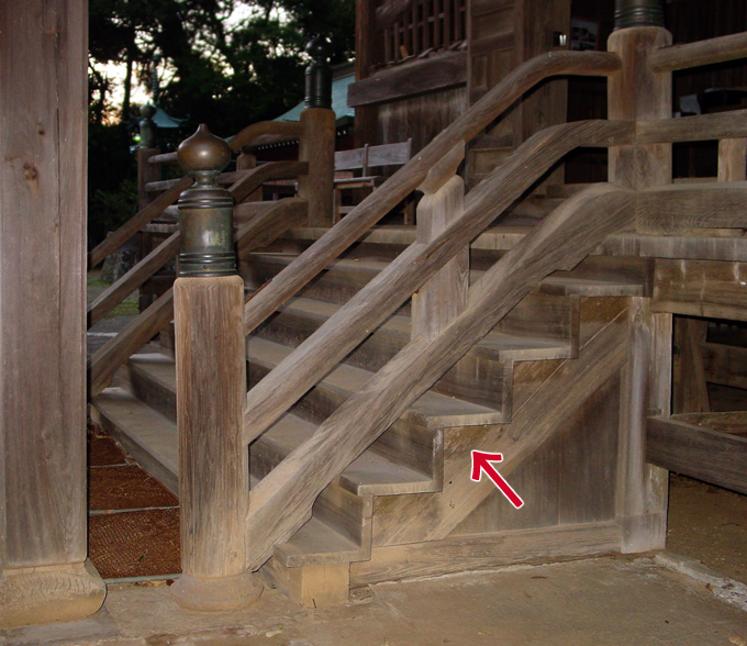 A string, or stringer. The boards set diagonally on each side of a staircase in order to receive the treads fumi-ita 踏板, and risers kawagi 側木. The upper part of the stringer is cut in a zigzag fashion to accommodate the treads and risers.
