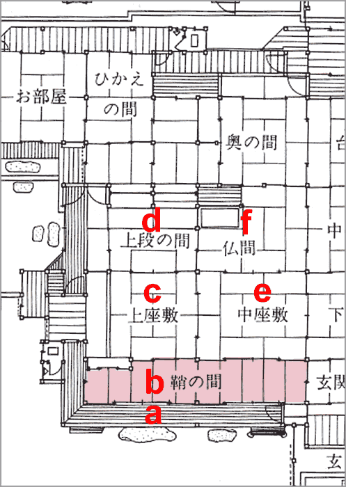 d) *jōdan-no-ma 上段の間 e) naka-zashiki 中座敷 f) *butsuma 仏間