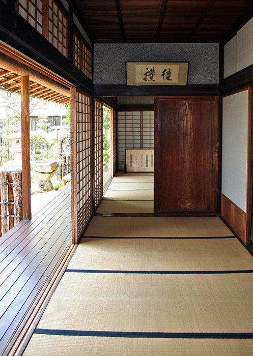 2 An interior, veranda-like space floored with thick straw mats *tatami 畳, that is associated with the shoin style *shoin-zukuri 書院造. The exterior wall is filled with moveable wooden screens *shitomido 蔀戸, and a simple veranda called otoshien-ita 落縁板 extends outward at a lower level. It is called otoshien-ita. The width of the saya-no-ma is 90 cm but there is no prescribed limit for the length. Saya-no-ma may also be found in a shoin style tea ceremony room *chashitsu 茶室.