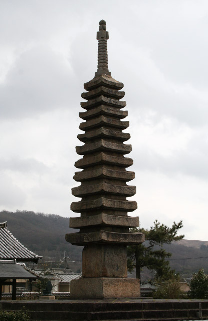 Also read ishitō. A generic term for pagodas or stupas made of stone. It includes multiple-storied stone pagodas such as the five-ring pagoda *gorintō 五輪塔, memorial or grave stones *kasatōba 笠塔婆, pagoda-like markers made of stone *itabi 板碑 and *hide 碑伝, and egg-shaped or oval stones on a square on octagonal stone base, used originally by the Zen 禅 sect, and called *rantō 卵塔 or *muhōtō 無縫塔. The multiple-storied monuments are frequently dedicated to Buddha and have no interior, but some have space hewn out in which to place a very small image. Like timber pagodas *tō 塔, stone pagodas always have an odd number of stories. Among those designated as important cultural assets, many 13, 9, 7, and 5-storied stone pagodas are extant and are in quite good condition. The only exception to the odd number rule is the 10-storied pagoda *Jūjūtō 十重塔 at Injōji 引接寺 (1386) in Kyoto. The tallest extant stone pagoda is 13-storied (14.12 m) *jūsanjū-no-tō 十三重の塔 and constructed at Hannyaji 般若寺 (1253) in Nara. The finial *sōrin 相輪, was replaced in the Shōwa period, but the original has been preserved at the temple. Each tier is square and the corners curve upward. The oldest sekitō have beautiful eave curvatures called shinzori 真反り and the vertical, exterior surfaces are cut perpendicular to the ground. Characteristically, the tiers are reduced in size as they rise, resulting in a strongly slanting silhouette, seen in the Hannyaji stone pagoda. Although almost all sekitō slant from bottom to top, the degree of slope varies: 5-storied pagodas narrow only slightly, while 9- and 13-storied ones narrow more obviously. The tiers are closely spaced and the lowest tier is usually set on a high base. There is no exact uniformity in the dimensions of the tiers, but their shapes are similar. Before the Kamakura period, soft stone like tuff *gyōkaigan 凝灰岩 was used, but during the Kamakura period granite, kakōgan 花崗岩, became popular. Images of Buddha are often carved on the shaft of the first story. More rarely, where stories are widely spaced, images or Sanskrit characters are carved in all the spaces between the tiers. Construction dates of the pagodas are also sometimes carved into the pagodas. Further examples include Hakubuji 白峯寺 (1324) in Kagawa Prefecture, a 13-storied stone pagoda, 5.62 m high. This is the east pagoda, of an east-west pair. At one time it had doors and is hollow to the 7th story. The large proportions of the double dais emphasize the narrow size of the tiers and shaft, jiku-ishi 軸石. A 7-storied stone pagoda from the 7th to 8th century survives at Eizanji 栄山寺, in Nara. The entire, original pagoda remains, even the finial. The lowest part of the high shaft has Sanskrit carved on it. The 7-storied sekitō at Sekininji 赤人寺 (1318) in Shiga Prefecture, 2.36 m high, has foliate panels *kōzama 格狭間 on four sides of the base and Buddhist images on the shaft below the first tier.
