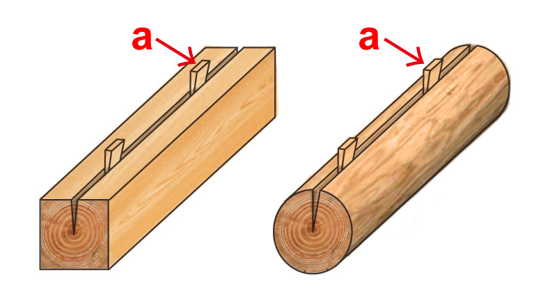 A method of preventing cracks in the heartwood *shinzai 心材 or jushin 樹心, of a structural timber, as for example, a pillar *hashira 柱. One side of the pillar is sawed through to the edge of the heartwood. Then wedges *kusabi 楔, are hammered into the cut, also up to the edge of the heartwood. The wedges are placed about 60 cm apart and are removed later when the timber has dried. The side with the cut wedge crack is placed so that it can not be seen.