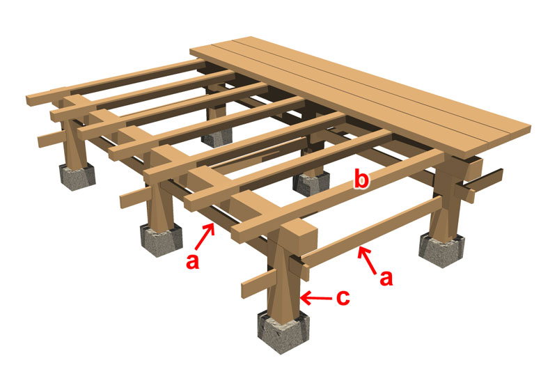 a) shibarinuki 縛貫 b) *neda 根太 c) *yukazuka 床束