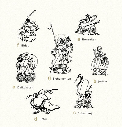 d) *Hotei 布袋 e) *Daikokuten 大黒天 f) *Ebisu 恵比須
