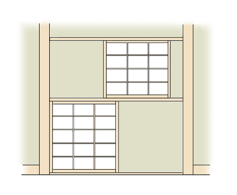 Lit. "poetry paper windows." *Shikishi 色紙 refers to the square paper on which short poems waka 和歌 or haiku 俳句 are written. In tea architecture, two square windows that are covered with *shōji 障子 paper and placed one above the other. Since the center vertical wooden strips of these small shōji rarely line up and are staggered, they often appear to be on the diagonal is achieved. Because many windows in tea ceremony house sometimes look as if they were scattered around the wall like pasted poetry papers, this type of window was named "poetry paper windows".