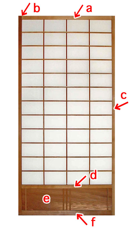 d) *nakagamachi 中框 e) koshi-ita 腰板 (*koshi 腰) f) shimogamachi 下框