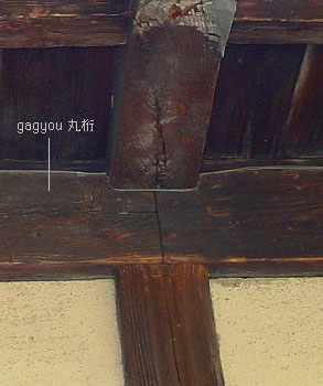 The junction of two lengths of a purlin that are set into the top of a post. The line of the joint is centered to coincide with the center of the post. If the purlin is circular, the top of the post is cut with an equally curved depression so that the beam fits snugly. To tighten the joint, a key *shachi 車知 is often inserted. This type of joint is used when the joined members are short. When two sections of a purlin are joined beyond the part secured by a tenon this is called a cantilevered joint mochidashitsugi 持出継. This joint tends to be weak if it is made more than 30 cm from the post. These joints are used for eave purlins *gagyō 丸桁.