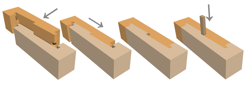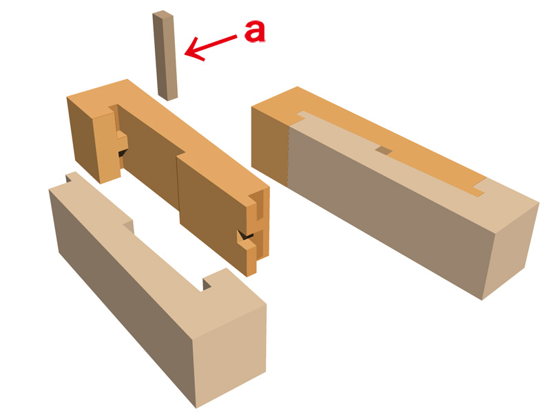 Also called shiribasami tsugi 尻挟継 or obasami tsugi 尾鋏継. A blind, stubbed, housed, rabbeted, oblique, scarf joint. A type of *kanawa tsugi 金輪継, a mortised, rabbeted, oblique, spliced joint. The shippasami joint has a T-shaped tenon and mortise and the two members to be joined are slipped in from the side. A pin komisen 込栓 (see *sen 栓) is inserted into a 15 mm square hole at the center of the joint to hold it securely. The tenon and mortise are not visible from the sides of the joint but a fine, straight line is discernible. This is the chief difference between the shippasami tsugi and the kanawa tsugi joint. This joint is used to connect beams and foundation footings.