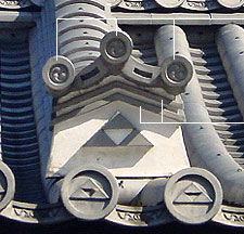1 Lit. "lion-mouth tile." An ornamental tile placed on each end of a main ridge, instead of the more common ogre face tile *onigawara 鬼瓦. The origin of the name is not clear. Shishiguchi are box-like forms with three or five tubular shapes on top and have semi-circular convex tiles *marugawara 丸瓦 with pendants *gatō 瓦当 attached. The pendants are usually decorated with comma patterns *tomoemon 巴文 surrounded by bead patterns *shumon 珠文, although some are undecorated. The patterns are said to represent sutra rolls. One or two chevron bands *ayasuji 綾筋 in relief decorate the front of the tile and sometimes continue around the sides. During the Momoyama period legs ashimoto 足元, or fins *hire 鰭, were often added, often using cloud or plant motifs. There are no examples extant from before the Kamakura period, but picture scrolls *emaki 絵巻 show buildings roofed with cypress bark shingles hiwada 桧皮 with a tiled ridge and shishiguchi at each end. The oldest extant shishiguchi is on the miniature shrine *zushi 厨子 in the *Shōryō'in 聖霊院 at Hōryūji 法隆寺 in Nara. Examples of shishiguchi exist from the Muromachi period up to the present day. In the Edo period, shishiguchi were known as either goshomune oni-ita 御所棟鬼板 or goshooni 御所鬼. See *kyō-no-maki 経の巻, *ayasuji 綾筋.